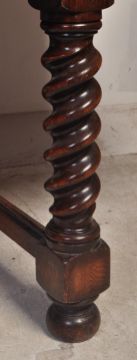 An early 20th century oak extending dining table having two leaves. Accompanied by nine chairs. The table having a rectangular top over barley twist supports. The chairs being in various styles with the majority having cane backs, barley twist legs and upholstered seats. Measures 74cm x 238cm x 119cm extended.