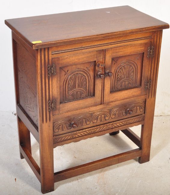 A vintage 20th century oak Jacobean Revival cupboard having a flared top over a double door cabinet opening to reveal a spacious interior raised on turned legs united by stretchers. Measures approx. 79cm x 68cm x 38cm