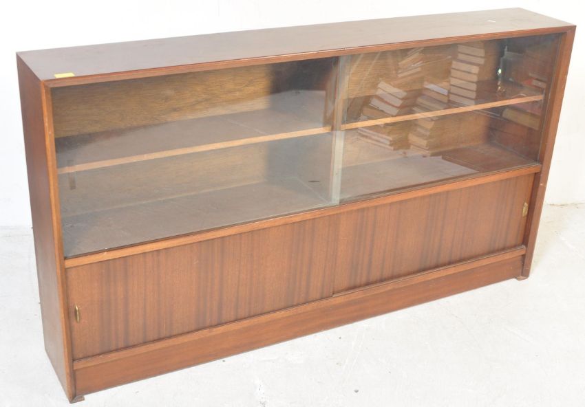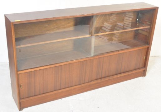 G Plan - Herbert Gibbs - A retro vintage mid 20th Century dark teak wood display / wall cabinet. Of rectangular form with twin glass sliding doors in front of shelves and twin wood shelves to lower. Measures approx 85cm x 152cm x 24cm.