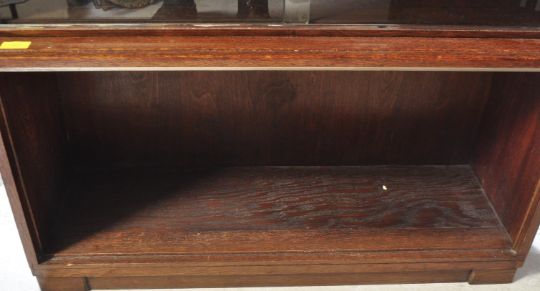 A pair of vintage mid 20th Century Minty oak stacking shelves. Of rectangular form with each section have twin sliding glass doors and atop a twin wooden door cupboard with metal pulls. Together with another without twin doors to bottom. All raised on a plinth base. Measures approx. 167 x 89 x 29cm.