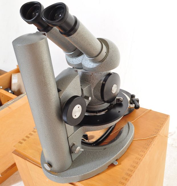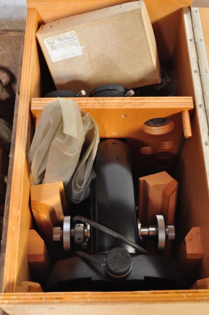 A group of three mid century microscopes to include two in beech wood hinged boxes. Measures approx; 31 x 22cm