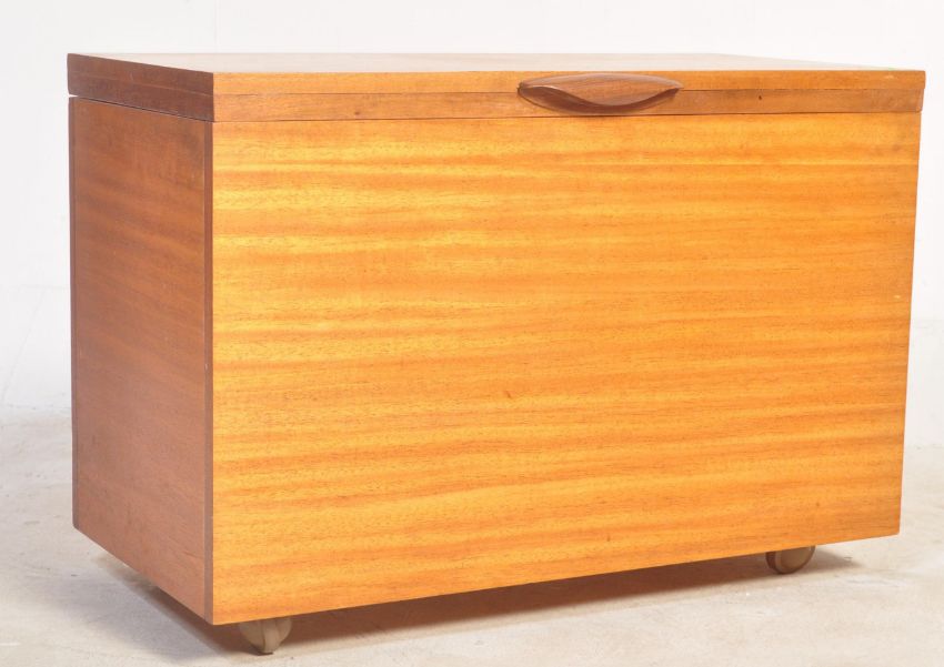 A vintage retro mid 20th century teak sewing box having hinged lid opening to reveal a fully appointed interior. Measures 46cm x 66cm x 35cm.