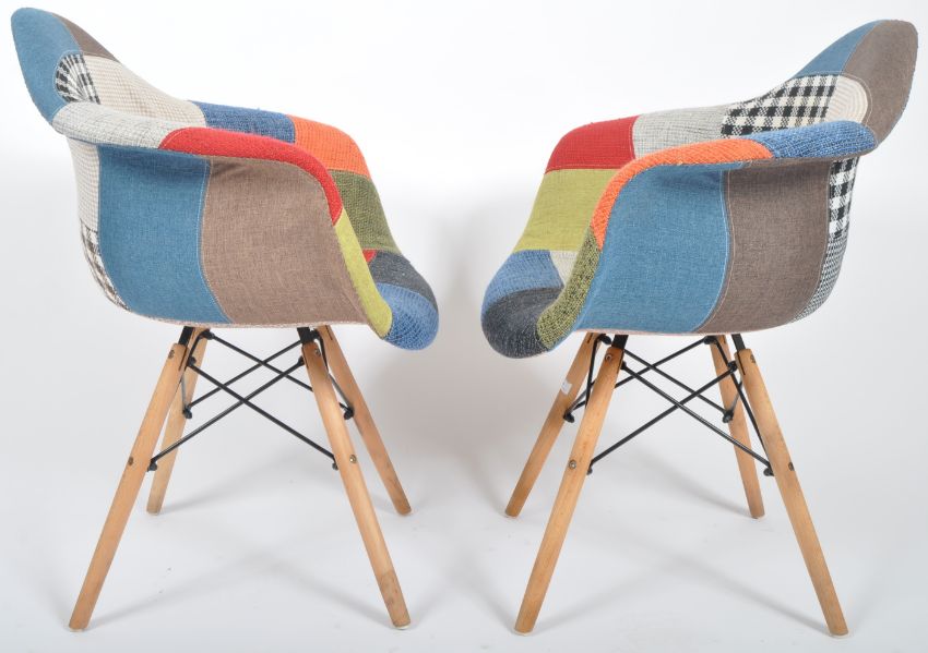 A matching pair of Contemporary Herman Miller DAX style dining carver chairs / armchairs each with patchwork upholstery. Each raised on splayed supports united by wire stretchers. Each measures approx; 83cm x 64cm x 48cm.