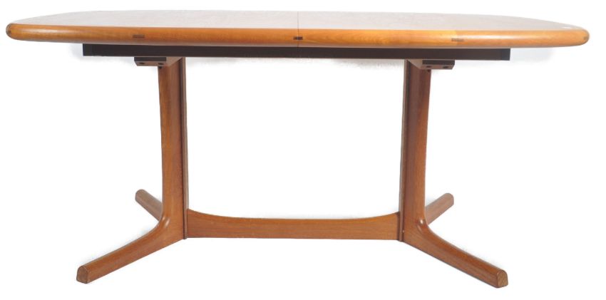 Dyrlund - A retro vintage mid 20th Century Danish 1970s teak dining table and matching six chairs. The extending dining table having a round rectangular top raised shaped supports. The set of six chairs having curved backrests with padded upholstered seat pads with each raised on straight supports united by stretchers. The table comes with two extra leaves. Table measures approx when closed; 74cm x 158cm x 106cm. Each chair measures approx; 78cm x 49cm x 45cm.