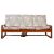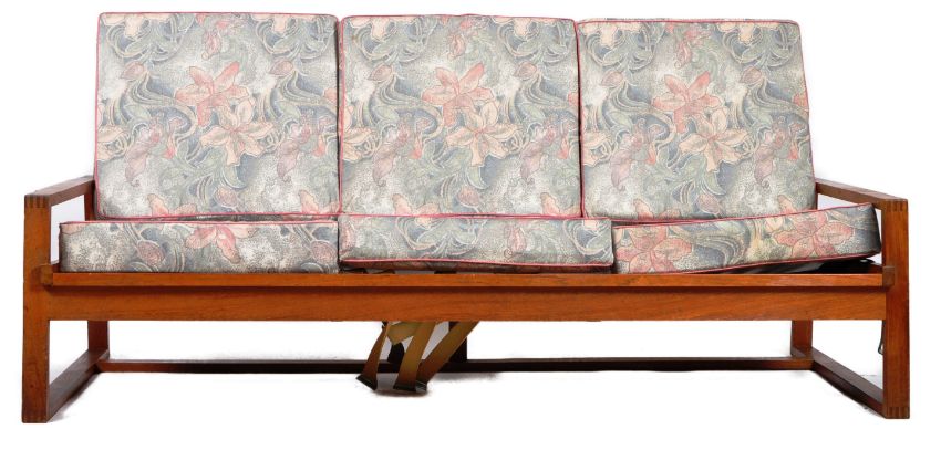 A retro mid 20th Century teak framed three seater sofa settee having a spindle backrests with webbing the underside and floral padded seat cushions. Teak finger joint armrests with all raised on shaped supports. Loose webbing. Measures approx; 72cm x 183cm x 61cm.