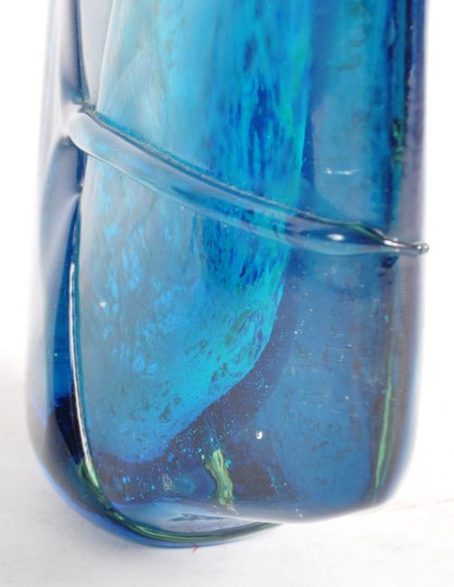 Mdina - Two pieces of 20th Century studio art glass comprising an Axe head vase in blue and a similar bottle decanter with rounded stopper. Axe head vase measures approx; 27cm tall & 22cm