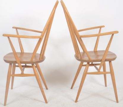 Lucian Ercolani - Ercol - Windsor Quaker Pattern - A matching set of four retro vintage 20th Century beech and elm dining carver armchairs / chairs having a hoop backrests over a panel seat raised on turned legs united by stretchers. Each armchair measures approx; 95cm x 62cm x 41cm.