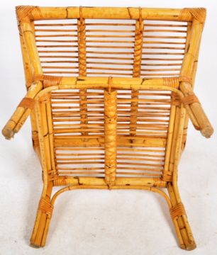 A matching pair of retro 20th Century bamboo armchairs and matching side table / coffee table. Each chair with domed cane backed backrests and scrolled arms raised on splayed bamboo legs. The table of rectangular form with bamboo frame and second magazine rack tier. Each chair measures approx; 96cm x 73cm x 57cm.