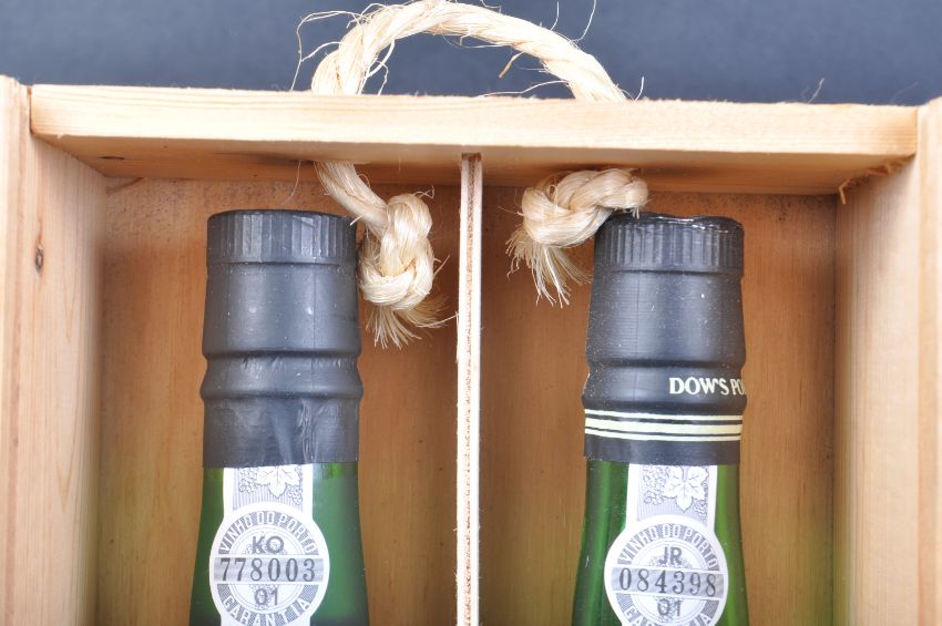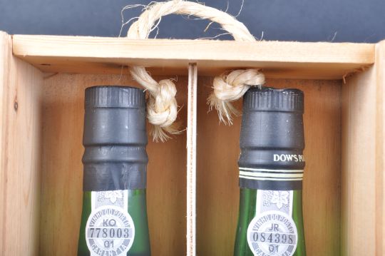 Two bottles of Dows port housed in a wooden presentation box both appear unopened and contain 37.5cl.