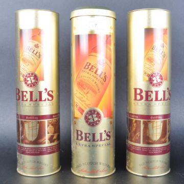 Three bottles of Bell's extra special scotch whisky all housed inside gold cylindrical tins. All seals appear unopened.