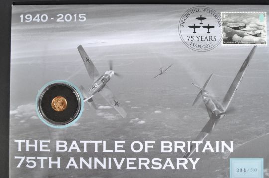 Coins / Stamps - The London Mint Office - 75th Anniversary Of The Battle Of Britain - officially issued Quarter Sovereign. Limited Edition No 304 / 500. Housed within its official folder, with certificate of authenticity. As new / mint. Sovereign encapsulated.