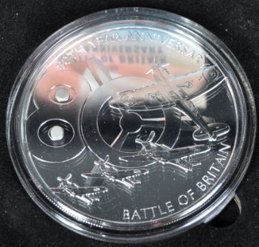 Coins - Bradford Exchange - ' The Battle Of Britain 80th Anniversary - Five Crown Coin ' - 2020 - silver proof coin set featuring a 5 Crown coin ' Layered in fine .999 silver with genuine metal taken from a Supermarine Spitfire and a Hawker Hurricane '. With certificate, housed in its original presentation box. As new. Limited Edition.