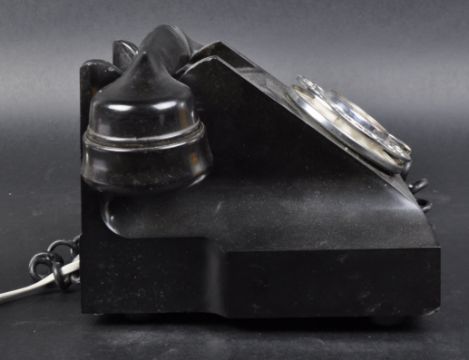 A vintage 20th Century Art Deco bakelite ring dial telephone of typical form finished in black. The phone having a central chrome dial and corded ear and mouthpiece. Sold as untested. Wear commensurate with age. Measures approx; 16cm x 24cm x 19cm.