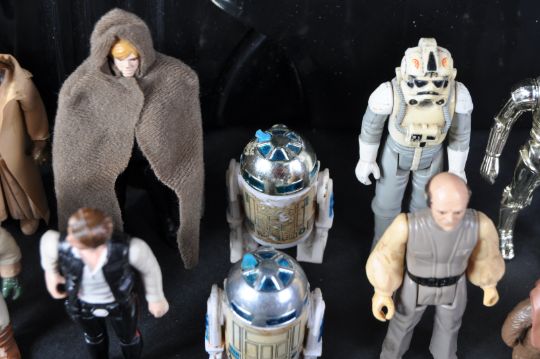 Star Wars - an original vintage Kenner made Star Wars ' Darth Vader Action Figure Carry Case ' along with a collection of x20 assorted action figures. Case is complete with all figure holders and all three tabs. Figures include; C3PO, Bespin Security Guard, R2D2, Death Squad Commander, Klaatu and others. Various conditions, from G to G+.