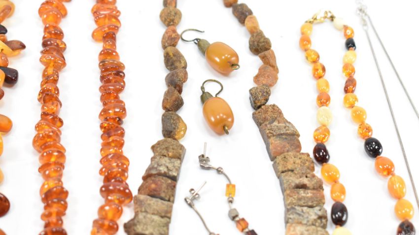 An assortment of silver and amber jewellery. The lot to include five amber necklaces including polished and raw, a pair of amber drop earrings, a silver and amber collar necklace and a silver and amber cat pendant necklace. Longest necklace measures 19 inches. Silver weight approx 20g.