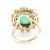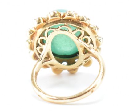 An 18ct gold emerald and pearl cluster ring. The ring set with a large high emerald cabochon framed by a halo of half pearls set within a scalloped and pierced mount to plain band. Emerald measures 15.6 x 11.8 x 10mm. French makers lozenge and eagle assay mark to exterior of band. Weight 9.6g. Size M.5.