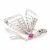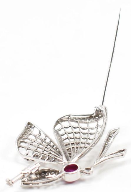 A 18ct white gold diamond and ruby butterfly brooch. The brooch in the form of a perched butterfly with pierced detailing to the wings being set with round cut diamond accent stones with an oval ruby cabochon to the body. Marked 18k with silver three crown mark. Measures 3cm high. Weight 7.8g.