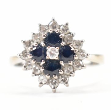 A hallmarked 18ct white gold diamond and sapphire cluster ring. The ring being set with four round cut sapphire and a cluster of round cut diamonds. Hallmarked London 1977. Weight 5.3g. Size R.5. Diamonds estimated 0.68ct in total.