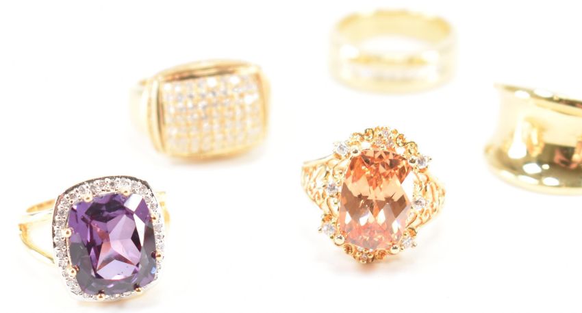 A group of 925 silver gilt gold tone rings. The lot to include; tapered shank concaved band ring, square cut cubic zirconia channel set ring, square cut pink stone set dress ring, CZ cluster ring, blue / purple & white stone split shoulders punched setting halo ring & a rectangular cut orange & white stone punched shoulders ring. All marked 925. Total weight approx 48.4g. Sizes approx Q - T.