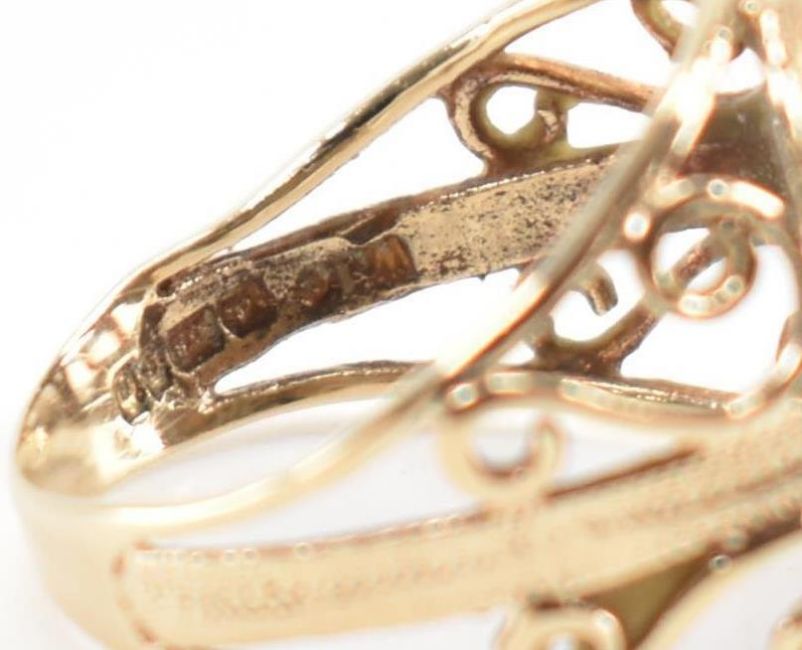 A hallmarked 9ct gold and diamond signet ring. The ring having an oval diamond set cartouche having scrolled filigree style shoulders. Weight 3.5g. Size K.5.