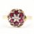 A vintage 18ct yellow gold, ruby & diamond floral cluster ring. The ring having a central round brilliant cut prong set diamond surrounded by a halo of six round cut rubies to depict petals all on a scalloped petal like cathedral mount on a pinched shank. Marked 18ct, makers marks for WJS. Diamond measures approx 3.3 x 3.3 x 2.3mm. Rubies measure approx 3.2mm. Total weight approx 3.8g. Size approx K.