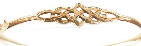 A vintage gold and diamond hinged bangle. The bangle having a knot design set with round cut diamond accent stones. Unmarked, tests indicate 9ct gold. Marked Dia 0.15. Weight 8.8g. Interior circumference 16.5cm.