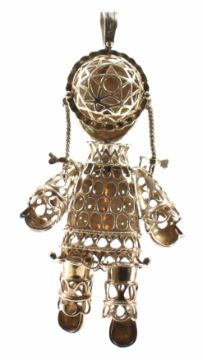 A silver hallmarked pedant in the form of a doll. The doll having articulated limbs and set with white and red stones. Hallmarked Birmingham. Measures approx 9.5cm. Weight 34.5g.
