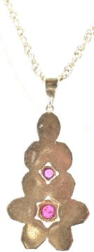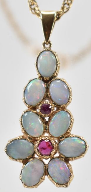 A hallmarked 9ct gold and opal and ruby pendant necklace. The necklace having a rope twist chain with a gold pendant set with nine opal cabochons and two round cut rubies. Pendant hallmarked Sheffield 1978, chain hallmarked Sheffield 1985. Chain measures 18 inches. Total weight 12.6g. Largest opals measures 7.2 x 5.3mm.