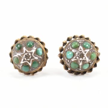 A pair of gold and green stone stud earrings. The earrings having domed tops set with round green stone cabochons. Tests indicate 9ct gold. Heads measure 11mm diameter. Weight 2.6g.