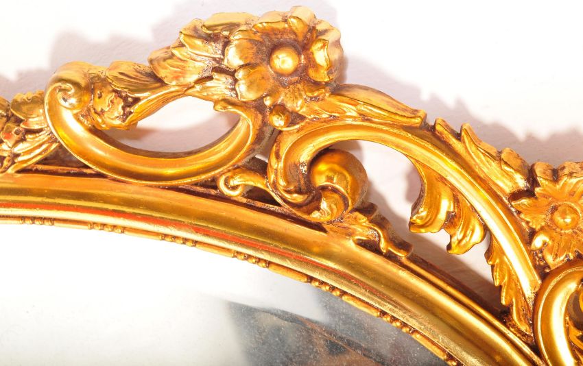A Veronese product made in England. A gilt hanging wall mirror. Of oval form with scroll foliate decoration to top, bead effect to inner border with bevelled edge to mirror. Measures approx. 84cm