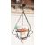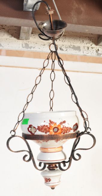 A retro vintage 20th century metal & ceramic pendant ceiling light having a ceramic shade with floral decorations held in a copper effect scrolled metalwork.