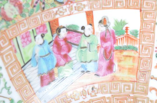 A large 19th Century Chinese Famille rose porcelain centerpiece bowl / fruit bowl. Intricate repeating Cantonese decoration with panels of figures, insects & birds among repeating botanical borders. Measures approx; 13cm x 29cm.
