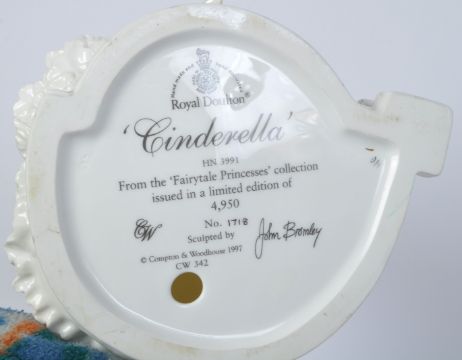 A vintage 20th century Royal Doulton bone china limited edition 'Cinderella' figure HN3991 from the "Fairytale Princesses" collection issued in a limited edition of 4,950 No. 1718 sculpted by John Bromley. It measures approx. 26cm tall.
