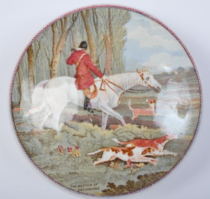 Two 20th century Prattware transferred print pots with lids. The lot to include The Cavalier & The Master of The Hounds. On the back of each pot it reads: 'The picture on this lid is one of a series printed from the Original Engravings used for the Ye Old English Pot Lids now so highly valued by collector. and first made in Staffordshire 1847 - 1870'. Each measuring 10cm in diameter and 5cm tall.