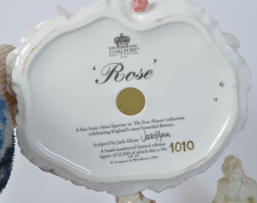 An assortment of vintage 20th century English bone china Royal Worcester & Coalport figurines. The lot to include Royal Worcester 'Mothering Sunday', 'The Fairest Rose', 'Royal Debut', together with Coalport 'Dame Margot Fonteyn', 'Rose'. Largest measuring 22cm tall.