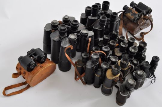 A mixed collection of 19 x vintage binoculars. Models are: Sperber 8 x 30 Wetzlar, Kershaw The Coldstream 6 x 24, Carl Zeiss Deltrintem 8 x 30, Carl Zeiss M G, Negretti & Zambra Extensia 6 x 30, Watson & Sons 1918, Beck Kassel CBS Spezial 7 x 50, International Marine 7 x 50, Zenith 20 x 50, Leikon 7 x 50, Hensoldt Wetzlar Hensar 9 x 36, unbranded 8 x, unbranded - polished brass plates, Kershaw The Monarch 10.5 x 40, Excellent Tokyo 15 x 50, W Watson & Sons x 6 (broad arrow marked) (cased), Eikow Bull Fight 7 x 21 (cased), Legacy 8 x 22, unbranded.