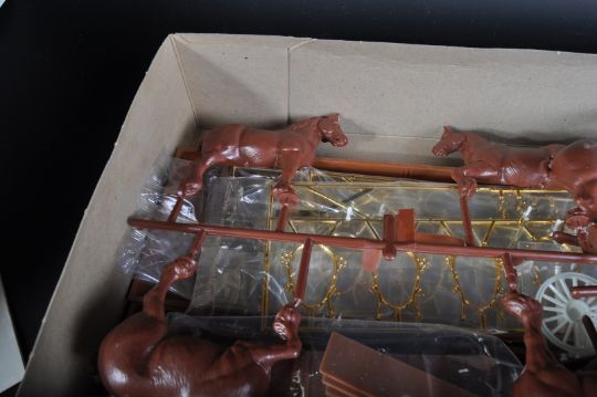 A vintage AMT ( Aluminium Model Toys ) 1/20 scale plastic model kit No. 7702 Budweiser Clydesdale 8-Horse Hitch. The kit appearing unused with sealed packets and original instructions present. Unchecked for completeness. Housed within original box.