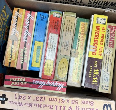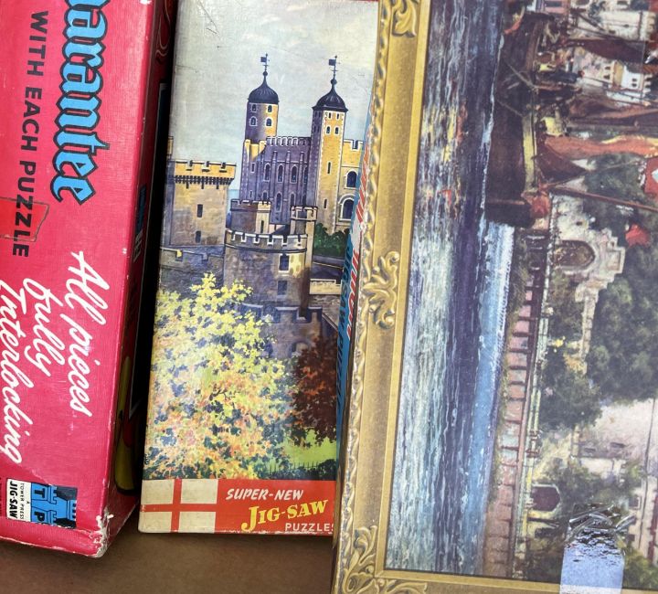 A large collection of approximately x25 assorted vintage British made jigsaw puzzles. Largely 500+ examples with some bigger sets also present. Various scenes to include; English villages, Royal processions, Kings and Queens, countryside, rivers and more. Puzzles bagged within original boxes. From a genuine childhood collection.