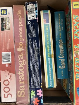A large collection of assorted vintage British made jigsaw puzzles. Largely 500+ examples with some bigger sets also present. Various scenes to include; English villages, Royal processions, Kings and Queens, countryside, rivers, steam engines, churches and more. Puzzles bagged within original boxes. From a genuine childhood collection.