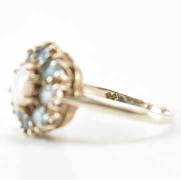 A hallmarked 9ct white gold, opal & blue stone halo ring. The ring having a central oval opal cabochon surrounded by a halo of round cut blue stones to pinched cathedral shoulders on a tapered shank. Hallmarked for London 2005, makers marks AP. Total weight approx 3.8g. Approx size Q.5. Opal measures approx 7.2 x 6.2 x 2.5mm.