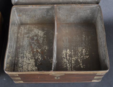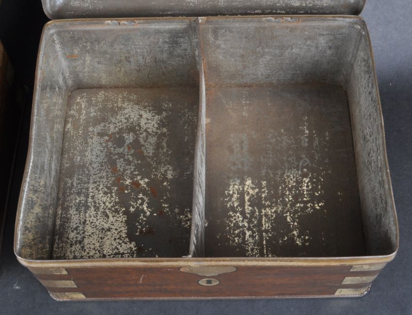 A pair of J&J Coleman mustard tins, circular purple sticker affixed to underside of hinged lid signed “ Colemans – Bulls Head – Fine Mustard – Warranted Pure “. Tin container made to look like a mahogany box with a key lock. Two compartments in one box. Circa 1900. Inscription on the box "J&J Coleman LTD Purveyor of Mustard To Him The King". Approx. 12.5cm x 24cm x 18cm.