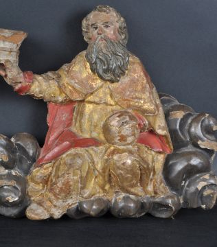 An 18th Century carved wood religious ecclesiastical wall plaque panel depicting God the Father and Christ. Holding a central crown with hand painted polychrome gesso decoration throughout raised on scrolled clouds. Measures approx; 29cm x 64cm,.