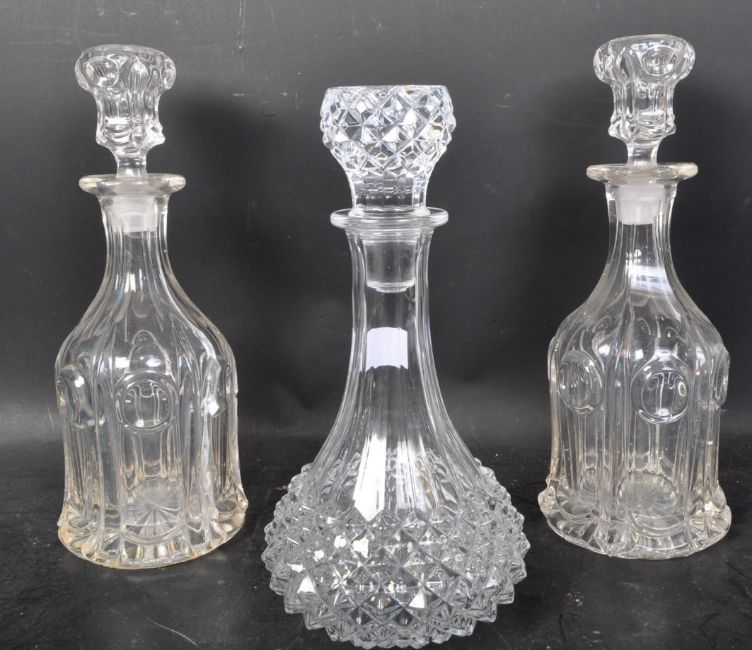A collection of 19th and 20th century cut glass decanters to include acid etched examples,ships and bell decanters, Complete with stoppers etc. Some with white metal labels on chains