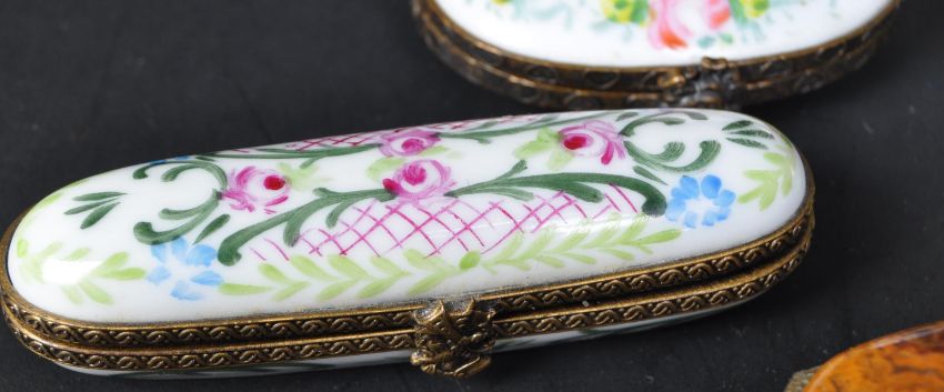 An assortment of nine 19th century & later porcelain and enamel pill boxes to include makers such as a hand painted magenta Limoges, France pill box, an oval shaped Limoges pill box with floral decorations, an Old Tupton Ware pill box, together with Crummles enamel pill box & more examples. Largest measuring approx. 6 x 4 x 4cm.