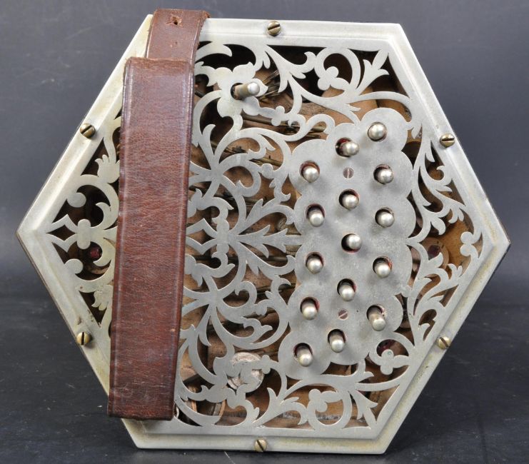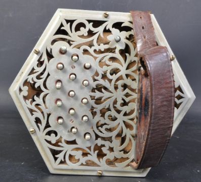 An early 20th century squeeze box concertina of octagonal form with tooled gilt Art Nouveau inspired details. Held within a fitted leather case. Measures 18th tall.