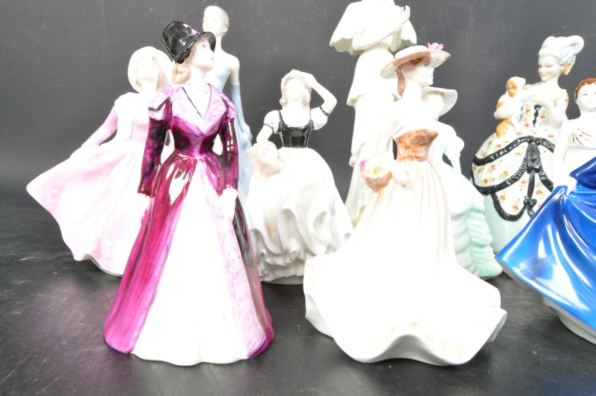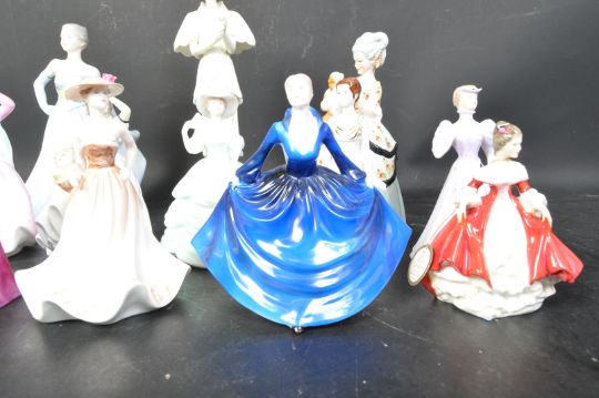 Coalport - A collection of Coalport bone china lady figurines to include Susan, High Society, Honor, Grace, Carla, Cathy, Dee, Crystal, Meryl. Overall good condition. Measures 25cm tall.