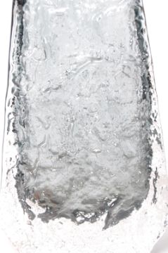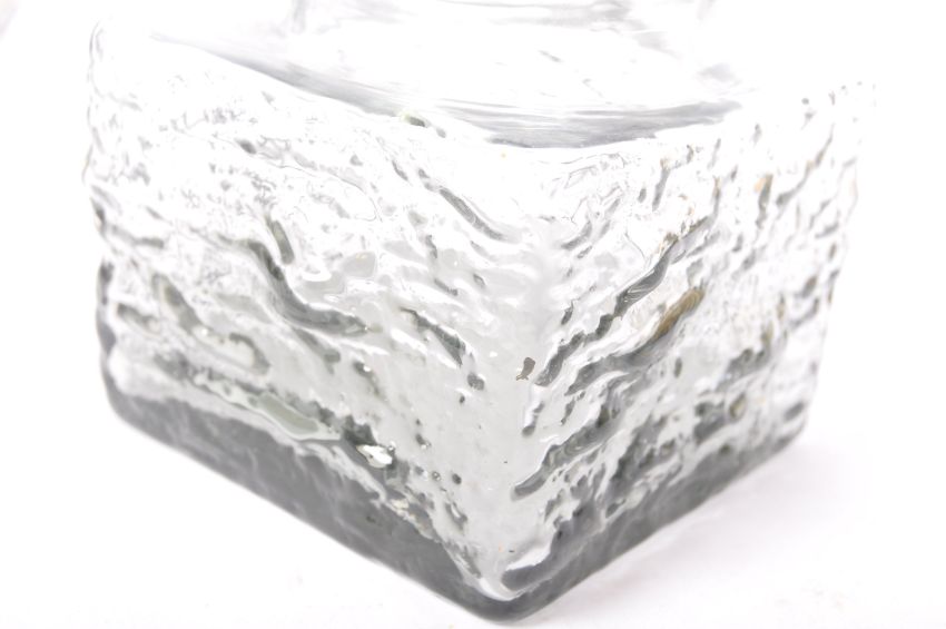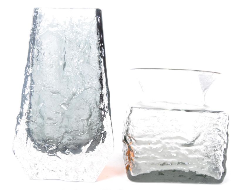 A retro vintage mid 20th Century Whitefriars coffin vase. Having a tapering textured body, in a blue / grey colourway. Together with a Frank Thrower for Dartington square vase. Measures 13cm tall.