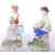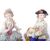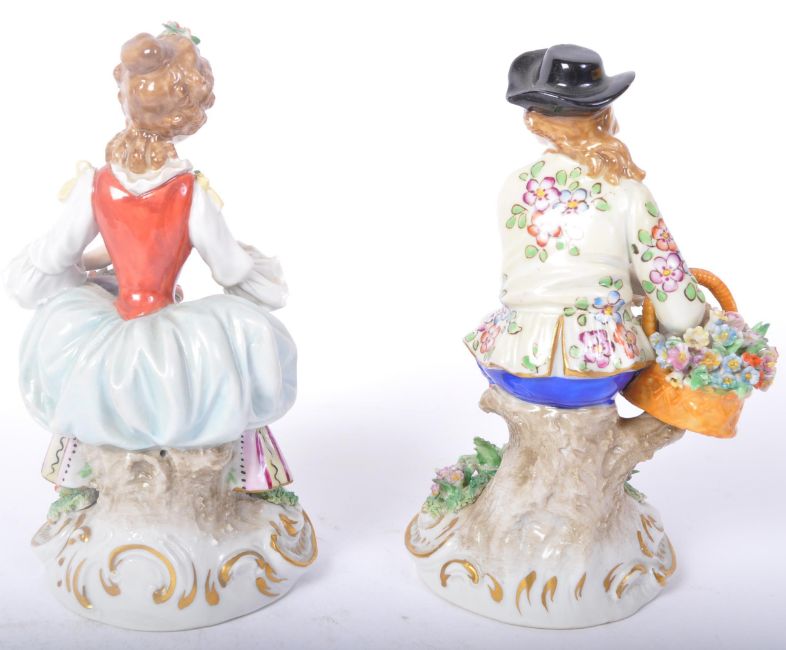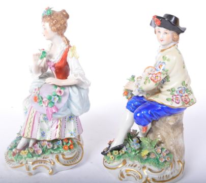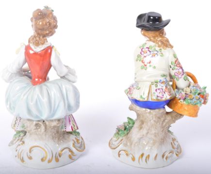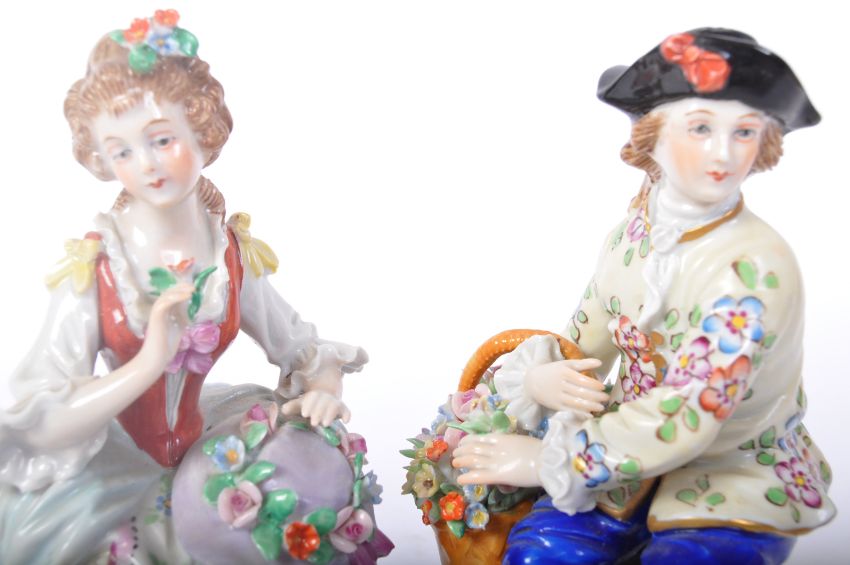 A pair of 20th century Continental German Sitzendorf bone china figurines of a young boy & lady sitting with flowers. Each measuring approx. 14.5cm tall.