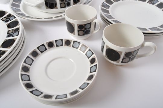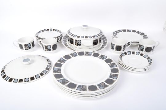 Midwinter - A retro vintage mid 20th century circa. 1960's part dinner and tea service comprising of tureens, serving plates, side plates and mugs. All having white ground with circle and square motifs to edge. Design by Barbara Brown.
