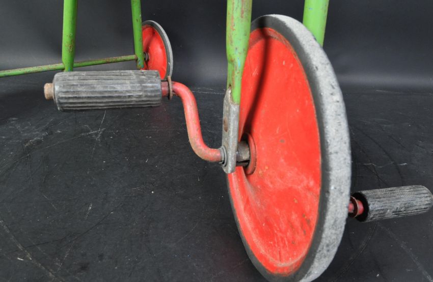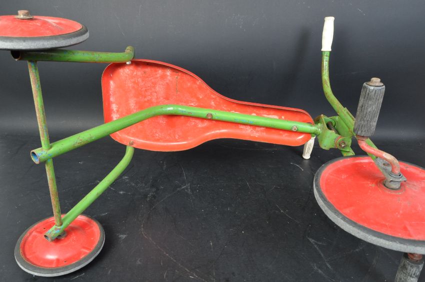 A vintage mid 20th century circa. 1950's Triang type children's bicycle bike trike in a red and green painted colourway. Wear to paint / some rusting but in good working order.